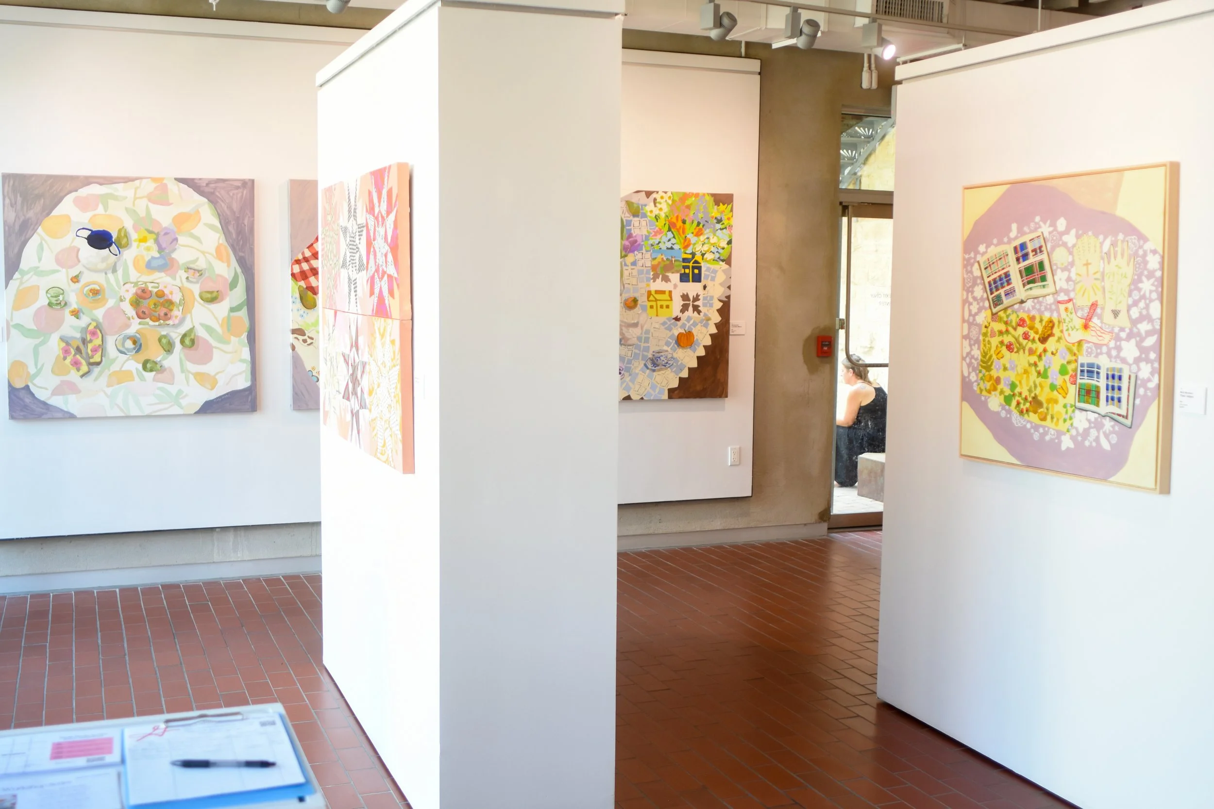 Frequented Dreams is an exhibition of paintings that highlight, florals, patterns, and quilting motifs to celebrate the labor and aesthetics historically associated with women. The table is a recurring subject, symbolizing community, sharing, and care. It serves as ametaphorical space where women’s stories and intuitive wisdom are honored. By exploring objects as carriers of memory, Mansfield highlights the continuity of women’s experiences across generations, emphasizing the vital role of heritage in shaping identity.